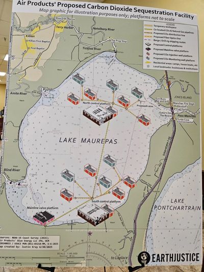 Air Products is full steam ahead in its pursuit of an Army Corps Clean Water Act section 404 permit and Louisiana Coastal Use Permit that would allow for the construction of a huge carbon sequestration facility that would spread throughout much of Lake Maurepas and operate for 25 years or more. Even though Air Products announced plans to sell off the carbon dioxide component of its proposed project and has halted new spending, it is pushing to secure permits so that it can attract a buyer to take over the carbon dioxide pipeline and sequestration facility.